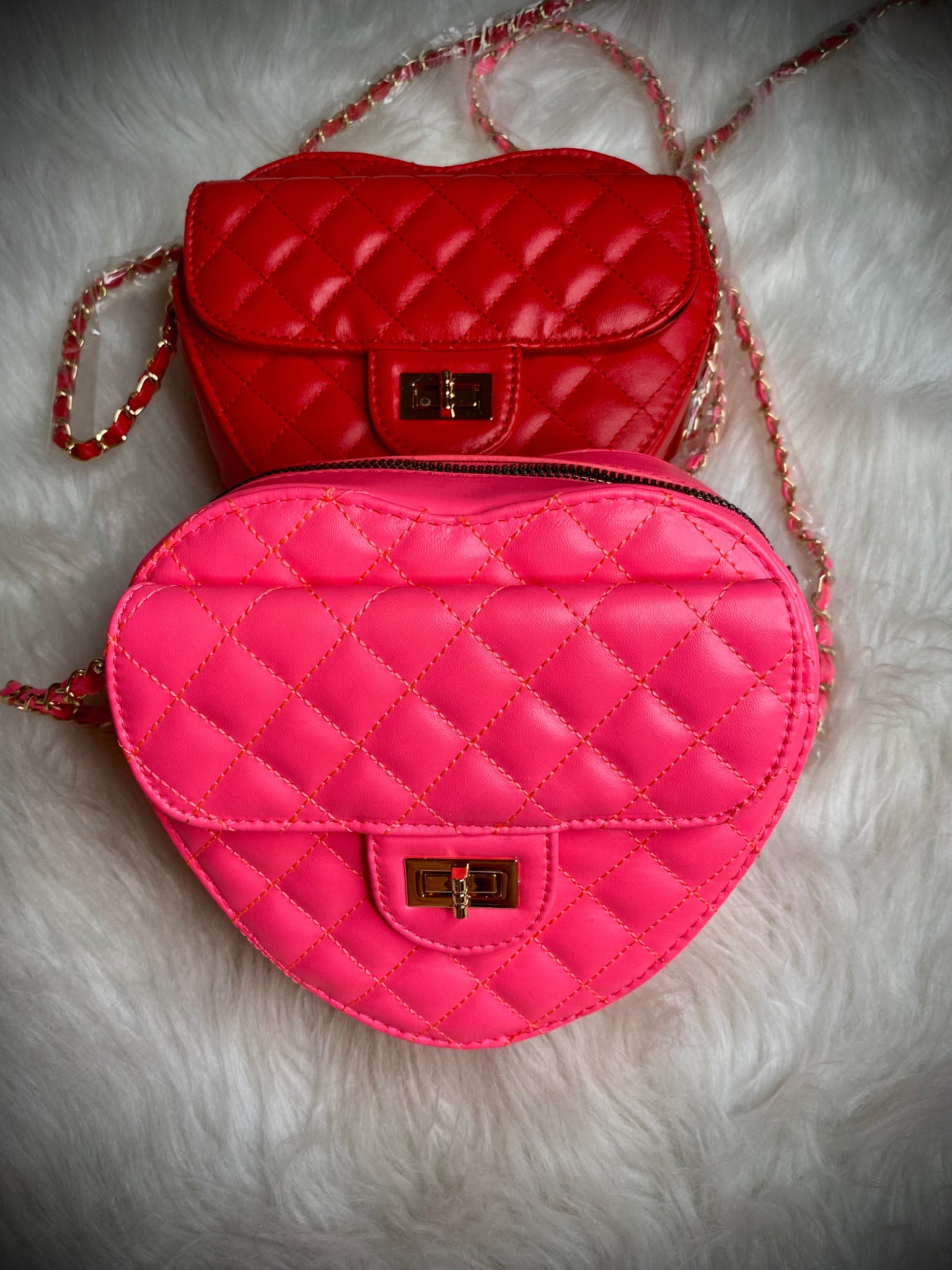 Super cute medium size heart shaped clutch purses with zipper and straps. There’s a pocket in the front and the back. The front smaller pocket has a little clutch that you can open and close. Then there’s a larger pocket than opens and close with zipper. Great for Valentine’s Day or as a gift or for heart lovers.